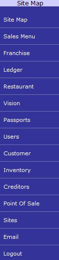 In this appendix, we will provide a quick reference table for Menu navigation in the Portal. The table below lists each screen that can be accessed from the Navigation Menu, a click by click navigation guide to access the screen, a link to the Zen Global Help topic that describes the screen in detail, and a brief description of the purpose of the screen. The Menu Navigation column describes how to navigate to the screen from the Site Map Menu, which can be accessed by clicking Menus and Site Map from the Navigation Menu. For example, the Site Tenders Report can be accessed from the Site Map Menu by clicking Sales Menu, Balance Reports and Site Balances (described in the Menu Reference Table as Sales Menu > Balance Reports > Site Balances). However, each link in the Site Map Menu can be accessed directly from the Menus link in all other menus, so there is no need to access the Site Map Menu directly. The Site Map Menu is displayed below for your reference, and the Menu Reference Table follows.