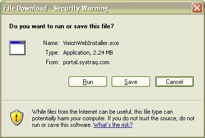 Go to URL http://vision.systraq.com/download/VisionWebInstaller.exe and save to C:\Winprogs\Vision (this folder will need to be created). Ensure the ‘Close this dialog……’ check box is unticked. This then prompts the installer to be run.