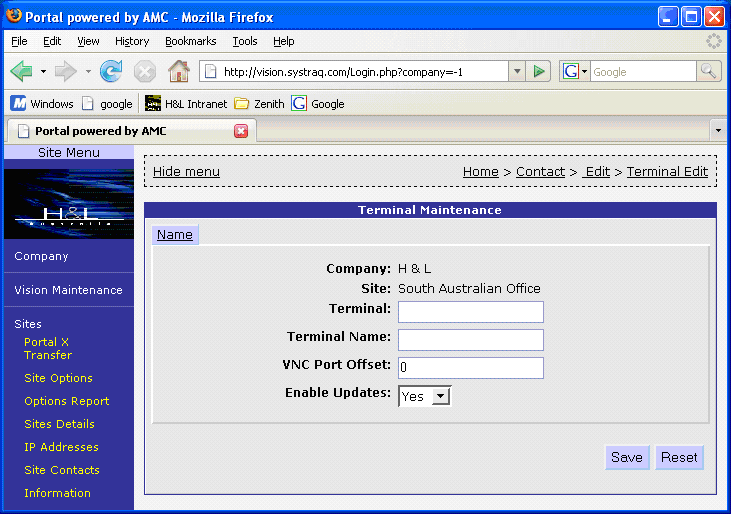 Go to Menu>Sites>Sites>Site Contacts>Site Name>Terminals>Create Terminal. Assign the Terminals for the Vision Streams as per pre-registration form. Click on Save after each terminal setup.