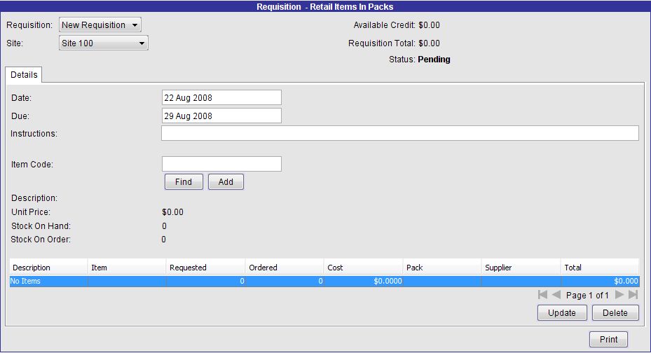 The Requisition drop-down list allows you to select a non-finalised requisition to edit or select "New Requisition" to create a new requisition. Select the Site from the provided drop-down list. The Date of the requisition is automatically displayed in the provided field but can be overwritten if desired. Likewise, the Due date is also automatically calculated and can be overwritten if necessary. Special delivery Instructions can be entered in the provided field. The Item Code field is used to enter items for the requisition. Use the Find button to search for items and use the Add button to add it to the order. As items are added they are displayed in the grid with some details such as the cost of the item. Enter the number requested for each ordered item; the line total is automatically recalculated. Press the Update button to update the changes to the items ordered in the requisition. If you make a mistake, select the wrong item in the grid and press the Delete button. The Print button is used to print the requisition.