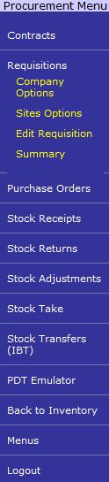 To create a requisition, open the Edit Requisitions screen from the Requisitions section of the Procurement Menu. The Procurement Menu can be opened by selecting Menus, Inventory and Procurement from the Navigation Menu.