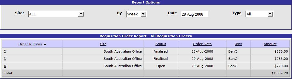 The Portal provides a report to view the status of Requisitions. This report can be accessed by selecting Summary from the Requisition section of the Procurement Menu. Displayed in this report is each Requisition's Order Number, the submitting Site, the Status of the Requisition, the date the order was submitted, the User that submitted the Requisition and the total amount that the Requisition is for. Select the Site to view and whether to view the Requisitions for the day, week or month of the entered date. The Type drop-down allows you to select to view Requisitions that are Pending, Finalised, Submitted, Deleted or All Requisitions in the report. Click on an Order Number to open the Edit Requisition screen to edit the selected order or resubmit it to Head Office.