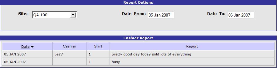 The Cashier Reports link in the Cashup section of the Point of Sale Menu opens a simple report which details the entries made to the Operator Report section of the Cashup Entry screen. Select the Site and date range to report on. The Cashier Report outlines the Date, Cashier, Shift and Report Details for each entry made.