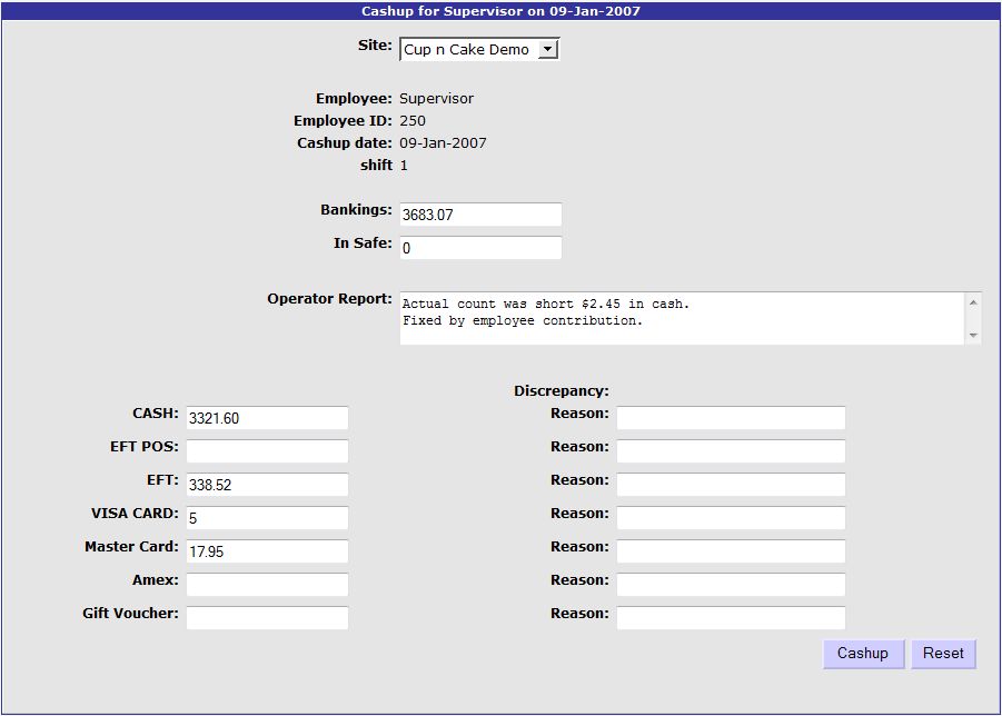 The Cashup Entry screen is where the cash counts are entered for the employee's tills. Ensure the correct Site has been selected. The Employee, Employee ID, Cashup Date and Shift fields display information regarding the cash count. Enter total amounts for Bankings and In Safe to reflect where the money has been stored. If desired, an Operator Report allows you to enter miscellaneous information regarding the count. For each listed tender type, enter the amount counted and a Reason for any discrepancies. Press the Cashup button to process the cash count. The Reset button can be used to reset the details of the count.