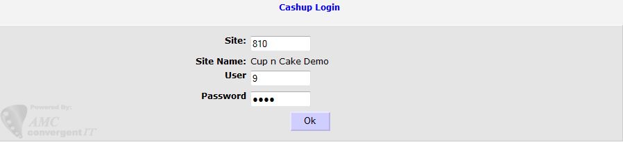 Select the Cashup link from the Cashup section of the Point of Sale Menu to open the Cashup Login screen. The employee performing the count of their till is required to login using their POS terminal login and password. Enter the Site number for the user, followed by the User name and Password for the clerk. Press the OK button to continue to the Cashup Selection Report.