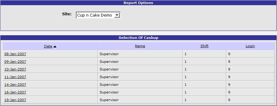 The Cashup Selection Report lists the currently outstanding tills for the employee at the selected Site. The report lists the Date, Employee Name, Shift Number and User Login for each outstanding cash count. Click on a Date to open the Cashup Entry screen for the selected day.