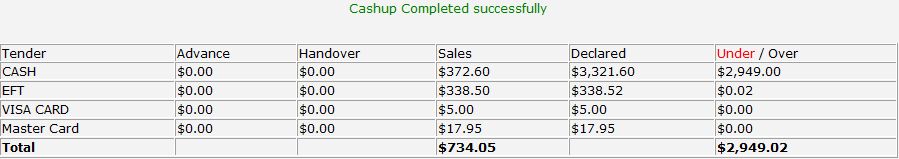 After the Cashup button is pressed, the count is processed. A report is displayed showing the Unders and Overs for each tender type.
