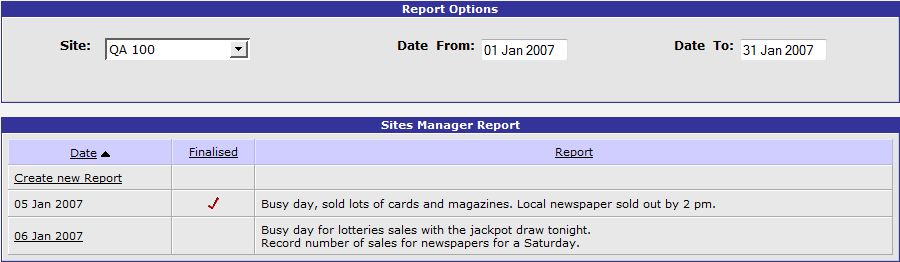 The Manager Reports link in the Cashup section of the Point of Sale Menu opens the Sites Manager Report. This feature allows the manager of a Site to enter details of the day's trade. The first screen lists all reports currently in the system. Select the Site and specify a date range for manager reports to be viewed. The Sites Manager Report lists the details of each report including the Date, whether the report has been Finalised, and the Report details themselves.