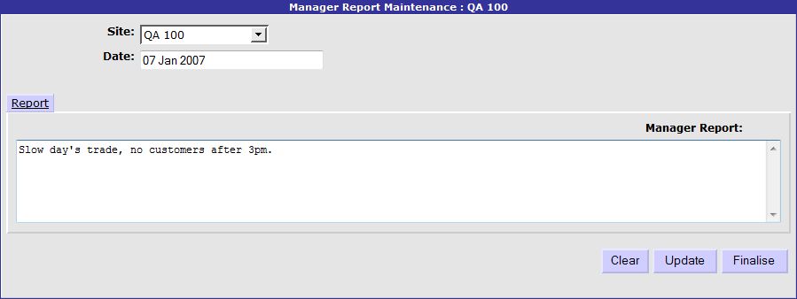 A link is provided in the Sites Manager Report to allow you to Create new Report. Clicking this link will open the Manager Report Maintenance screen, allowing the manager to enter the report for a day's trade. The Sites Manager Report screen also allows you to edit the details of any non-finalised report in the Manager Report Maintenance screen by clicking on the Date link for a report. In the Manager Report Maintenance screen ensure that the correct Site is selected and select the Date for the report. Enter the details of the report in the Manager Report section.