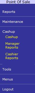 The Point of Sale Menu can be opened by selecting Menus and Point of Sale from the Navigation Menu. The Cashup link will open the Cashup section. In this tutorial we will investigate the screens accessed by the three links in the Cashup section of the Point of Sale Menu: Cashup, Manager Reports and Cashier Reports.