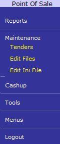 We begin this tutorial by navigating to the Point of Sale Menu. Select Menus and Point of Sale from the Navigation Menu. The Maintenance link will open the Maintenance section of the Point of Sale Menu. In this tutorial we will discuss the screens accessed from the three links of the Maintenance section, Tenders, Edit Files and Edit Ini File.