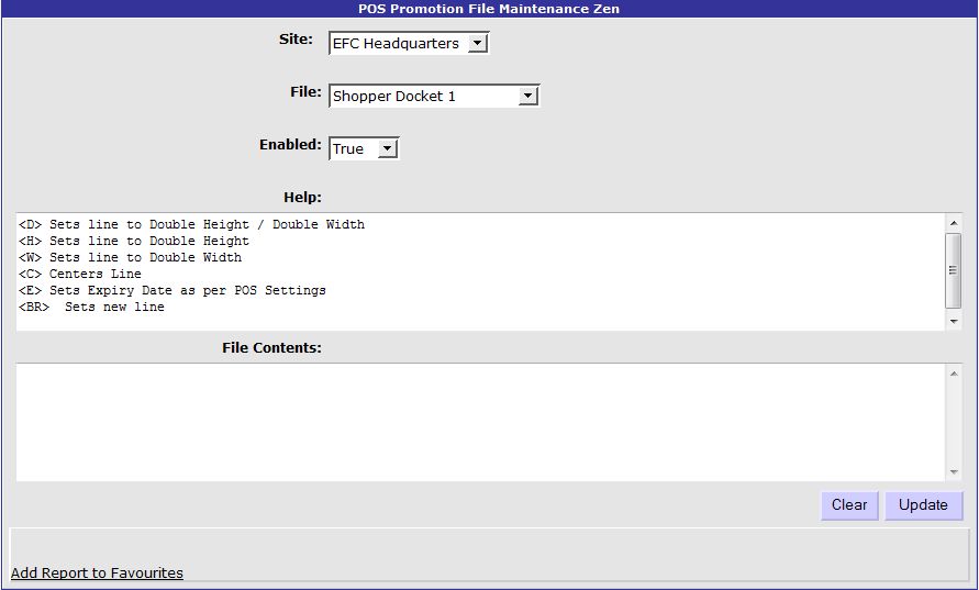 The File Contents section is where you can edit the file details. Anything that is written here will be printed on the receipt from the terminals at the Site, formatted by the tags listed in the Help section of the screen. The Clear button can be used to delete any text in the File Contents section, and the Update button is used to save any changes made to the file. When the File Contents are saved, the files are sent to the terminals at the selected Site, updating their receipt docket details.