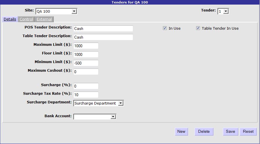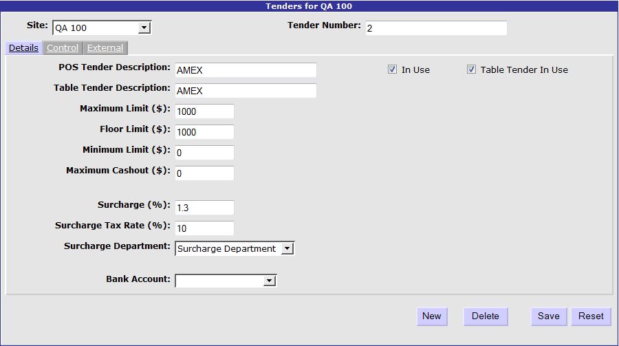 Surcharge: This allows you to specify a percentage surcharge, charging the customer a percentage of the sale for using the tender type. This is common for Credit Cards so that the Site can recoup some or all of the cost of using the tender charged by the financial institution. In our example we have set the AMEX Surcharge at 1.3%.