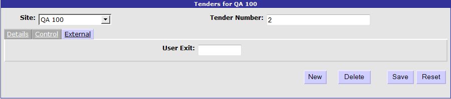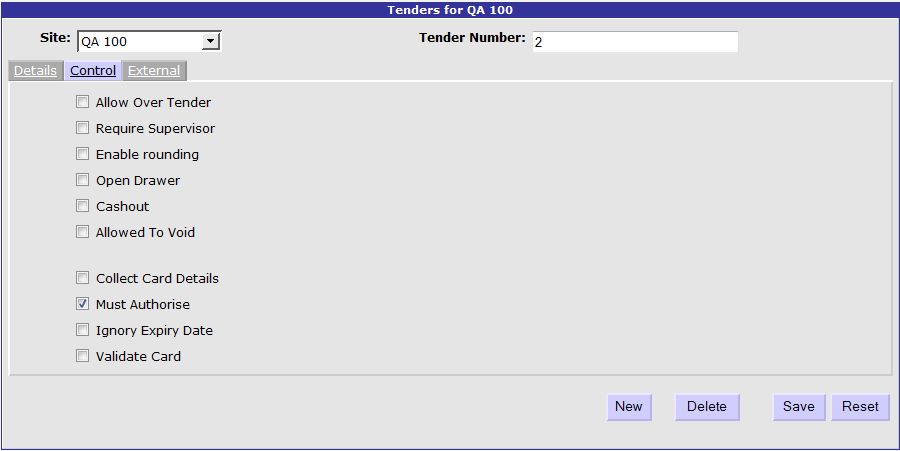 In this tutorial we will create a new tender type for AMEX payments. Make sure you have the correct Site selected and press the New button. Enter a unique Tender Number in the field provided. There are three tabs of information that needs to be filled out for a new tender type: