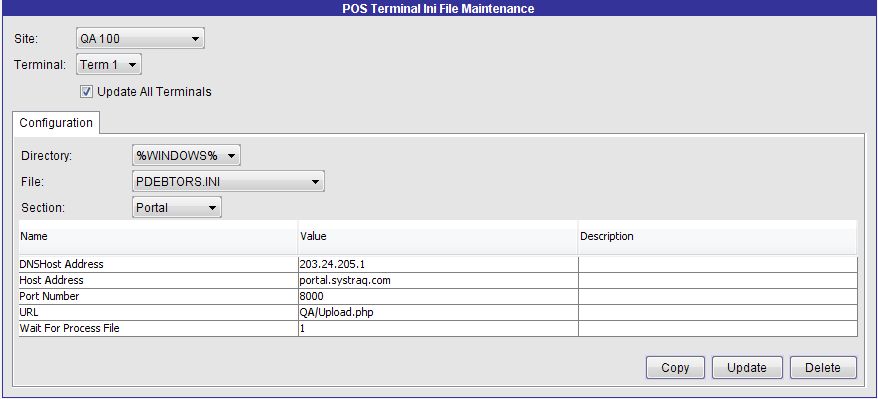 Update, saves the current configuration settings to the ini file and sends the updated file to the POSPortal terminal.