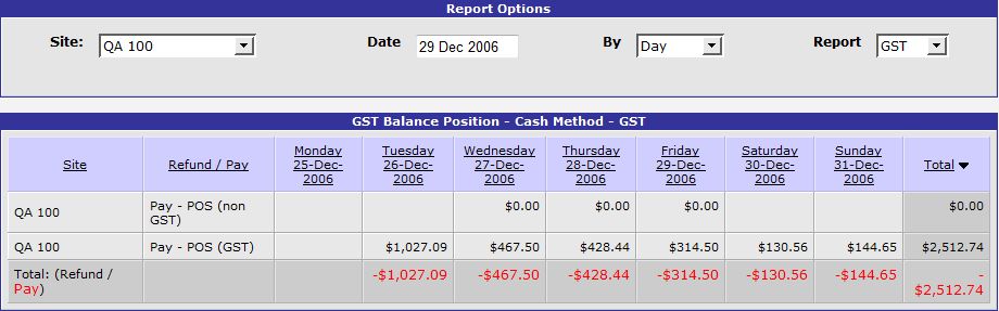 The final link in the GST Reports section of the Sales Menu opens the GST Balance report. This report provides GST totals for the selected Site during the specified period for either the GST or the Value of Sales (according to the Report selection). A distinction is made between payments and refunds and totals are displayed for GST transactions and non-GST transactions.