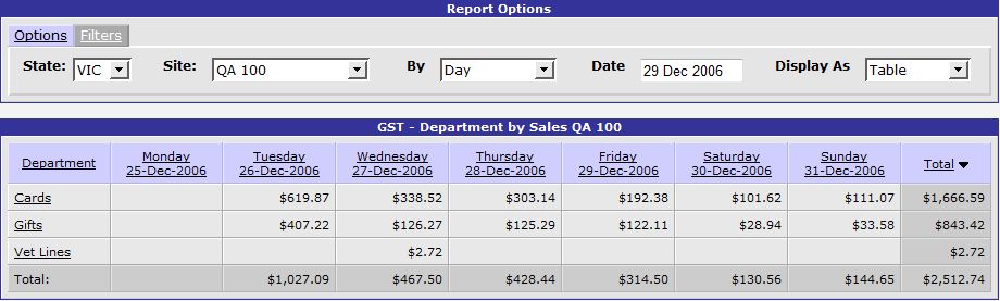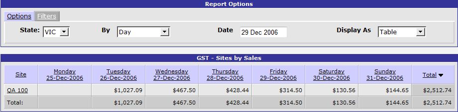 The first report that we will discuss in this tutorial will be the GST Sites Sales report. This can be opened by selecting the Sales link in the GST Reports section of the Sales Menu. This report lists the GST payable by each Site in the selected State during the specified period. Use the Display As drop-down list to view the details in a table or line, pie or bar chart. The Filters tab allows you to set the Type of data in the report - sales, sales percentage or dollars per customer. Click on a Site Name to open the GST Department Sales report for the Site.