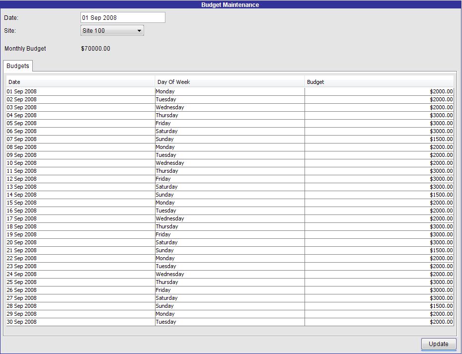 The Budget Maintenance screen allows you to create a budget for the days in a month period. Enter the Date for the budget and the month will be loaded into the grid section of the screen. Select the Site for the budget in the drop-down provided. Each day is listed in the grid with the date, day of the week and the daily budget (a default amount will be loaded for each day when creating the budget - these defaults are set in the Site Options Sales Targets screen). A total of the Monthly Budget is displayed above the grid. For each day of the month, enter a target to be met. Once complete, press the Update button to save the new budget in the Portal.
