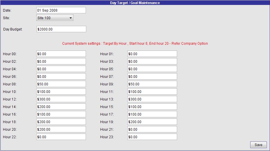 Sales targets can also be set by the hour for a Site in the Sales Targets screen. This can be accessed by selecting the Targets link from the Sites section of the Site menu. A Date and Site can be selected and a budget for the day is displayed. Each hour can have a budget set by entering the amount in the corresponding hour (in 24-hour time). Press the Save button to save the hourly budget for the day.